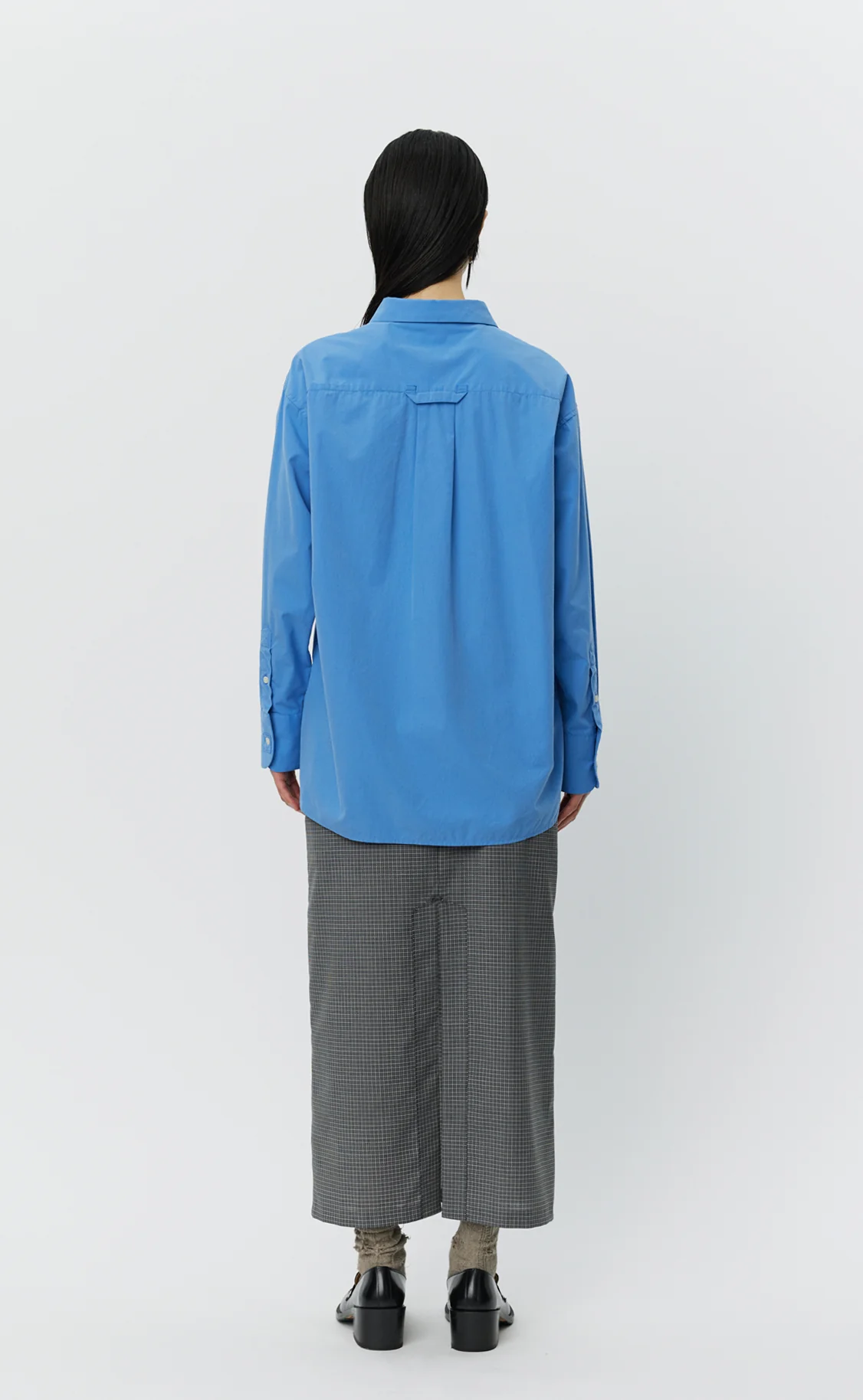 The Irregular Shirt has an oversized fit with drop shoulders and an irregular hem, straight at the front and curved at the back with split side seams. Made with front placket, spread collar and back yoke featuring a hanger loop with raw edges. Cut from a brushed organic cotton with a soft hand feel in a dark sky blue.