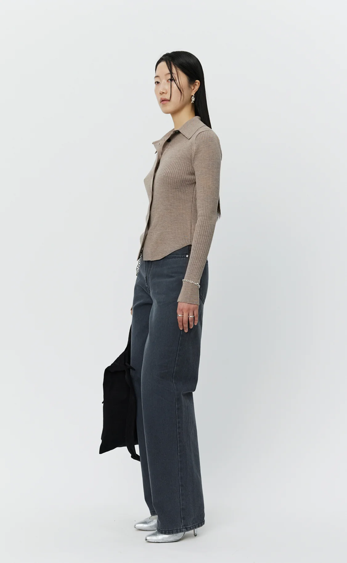The Knitted Rib Shirt has a slim fit with a slightly curved hem. Featuring a spread collar, button placket and slits at the sleeve hems. Knitted from a grey beige fine merino wool yarn with a 4x2 rib knit throughout the body.