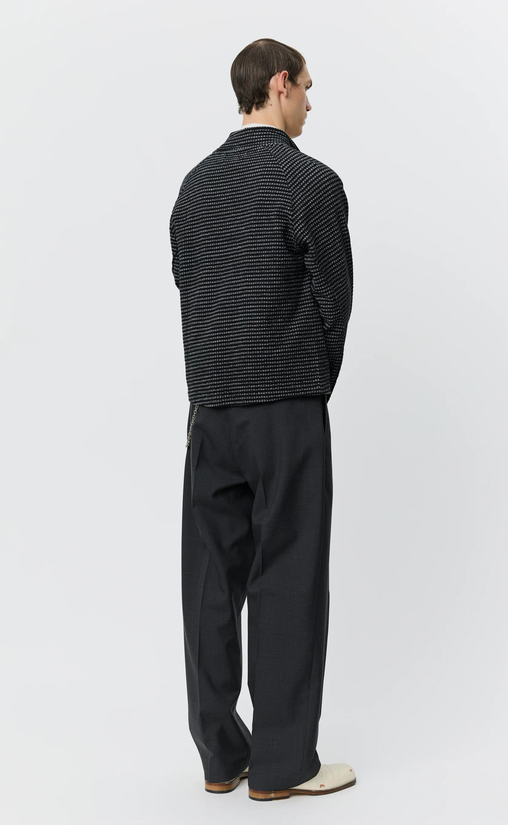 The Leisure Zip Up has a regular fit with raglan sleeves. Featuring reversed flatlock seams and a two-way zip. Cut from a soft, lightweight jacquard cotton jersey with black and grey checks on a black ground.