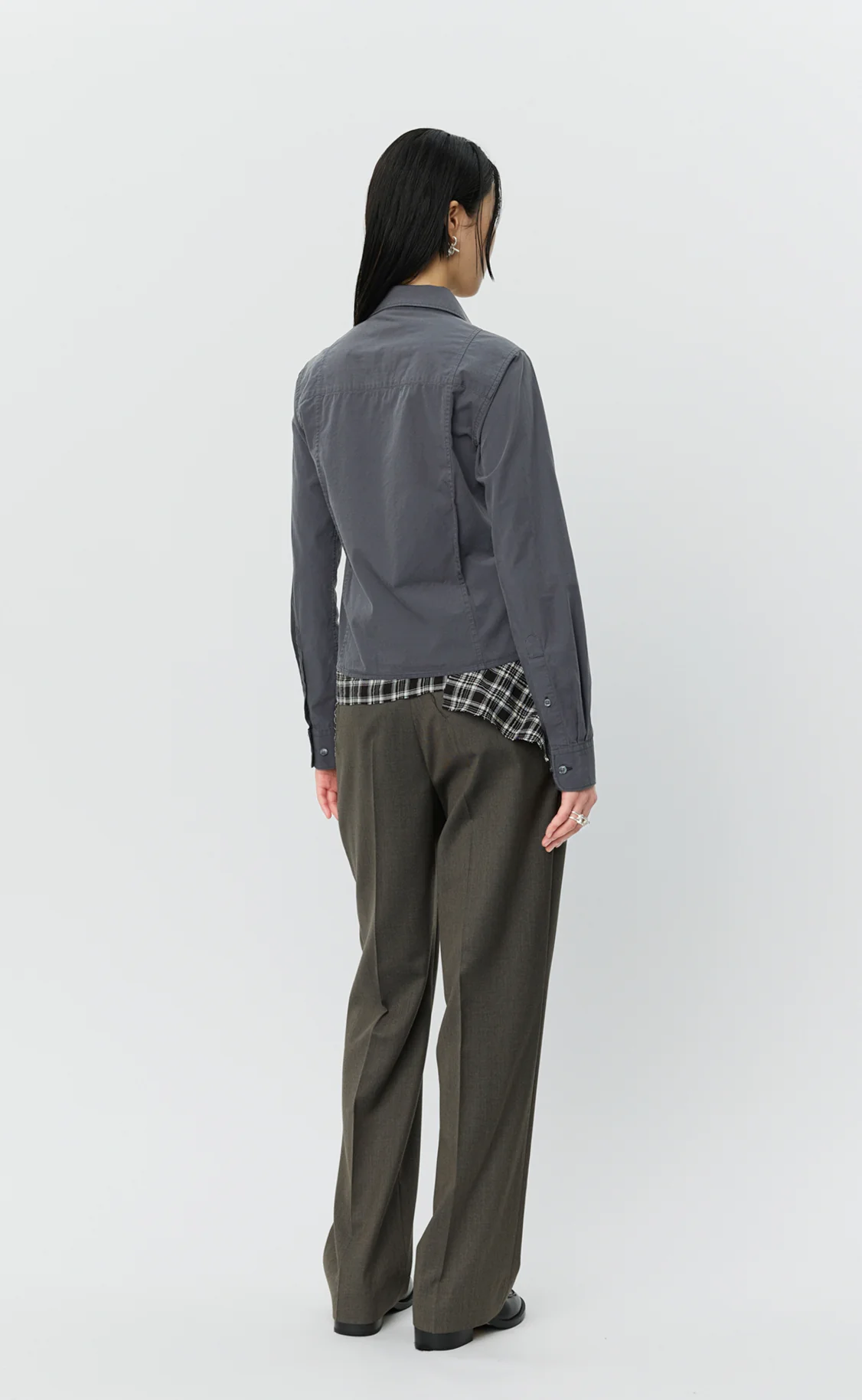 The Readers Shirt has a slim cropped fit with a curved hem. Featuring two-way zip placket, spread collar, back yoke and contour panels at front and back. Cut from a garment washed organic cotton in faded grey.