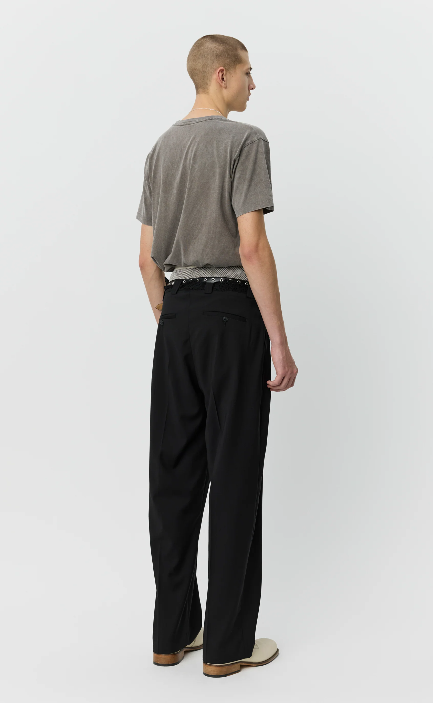 The Service Trousers has a wide straight fit with single pleats and a mid-rise. Featuring side pockets, rear welt pockets, button fastening, hook-and-eye closure and YKK zip fly. Cut from a fine wool twill with a dry hand feel in black. Made in limited quantities, available exclusively on mfpen.com and in the Copenhagen mfpen store.