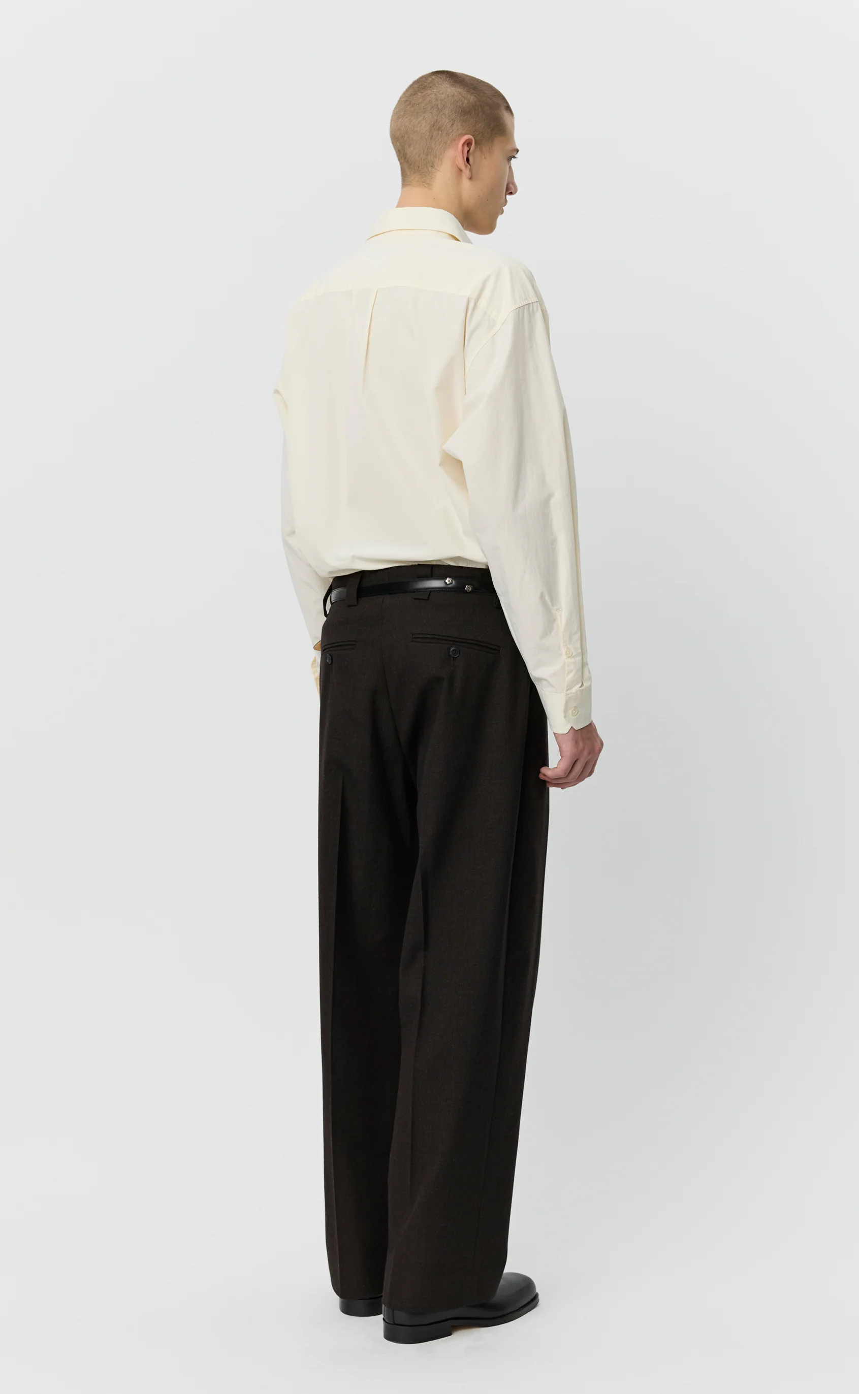 The Service Trousers have a wide straight fit with single pleats and a mid-rise. Featuring side pockets, rear welt pockets, button fastening, hook-and-eye closure and YKK zip fly. Cut from a dense Italian wool twill with a subtle two-tone weave in dark brown. Made in limited quantities from deadstock fabric, available exclusively on mfpen.com and in the Copenhagen mfpen Store.